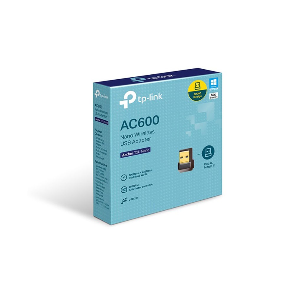 The TP-Link Archer T2U AC600 Nano Wireless USB Adapter provides high-speed dual-band Wi-Fi connectivity for desktops and laptops.