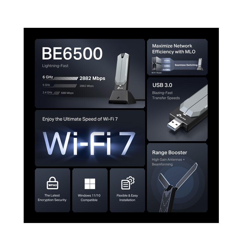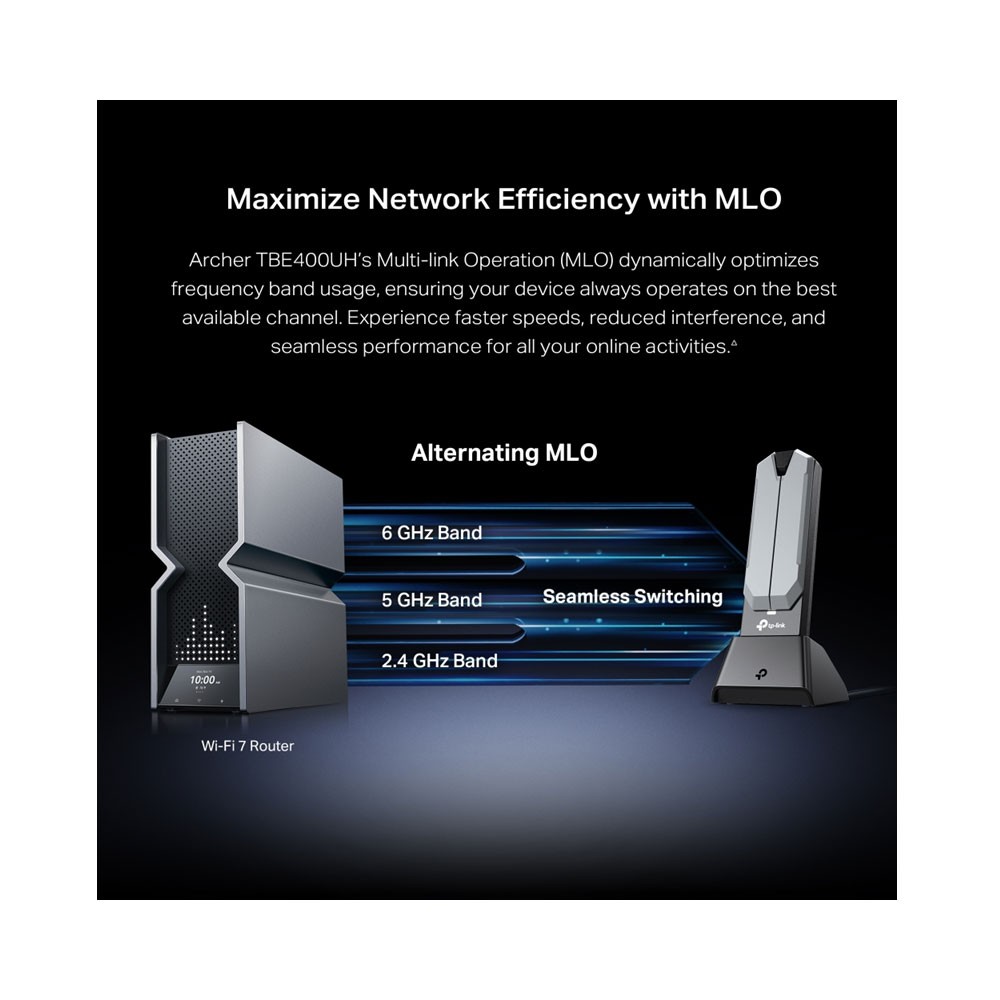 The TP-Link Archer TBE400UH BE6500 brings next-generation wireless performance to your PC or laptop with WiFi 7 tri-band technology.